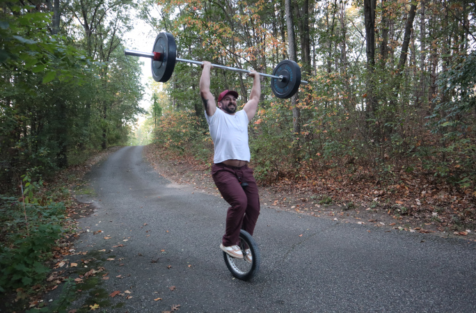 As an avid weightlifter, Dan decided to claim a spot in history by doing what he does best: lifting weights. The twist is that he decided to do so while balancing on a unicycle. The act not only requires an immense amount of physical strength to lift the weight, but also the focus required to balance calmly.
