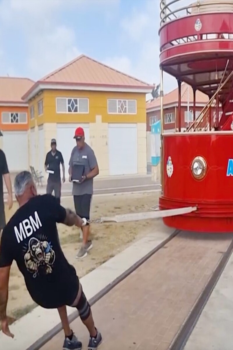Multiple record-holder Egmond pulled the 35,000 lb (15,875 kg) tram with just his middle finger.