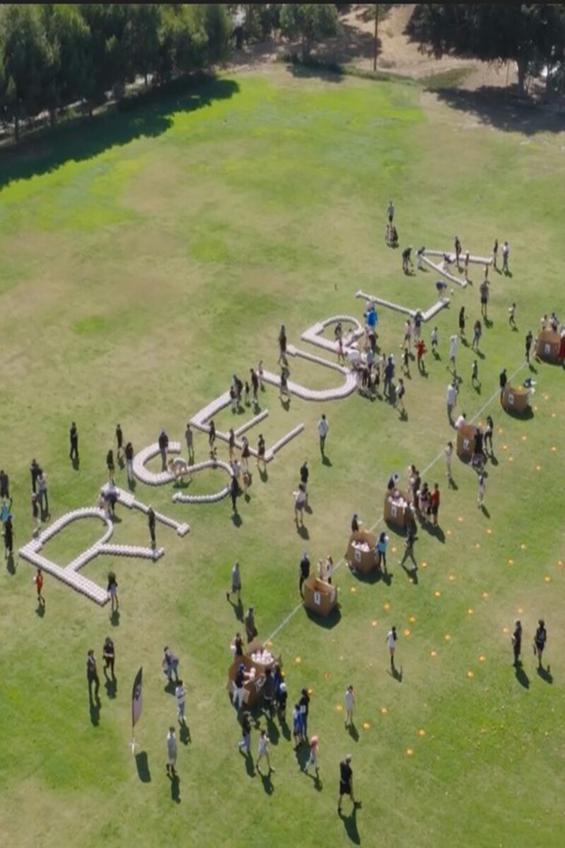 The balls spelled Rise up L.A. as a message of encouragement after the 2025 Los Angeles wildfires. The balls were put into place by local families and then donated to youth sports programs.